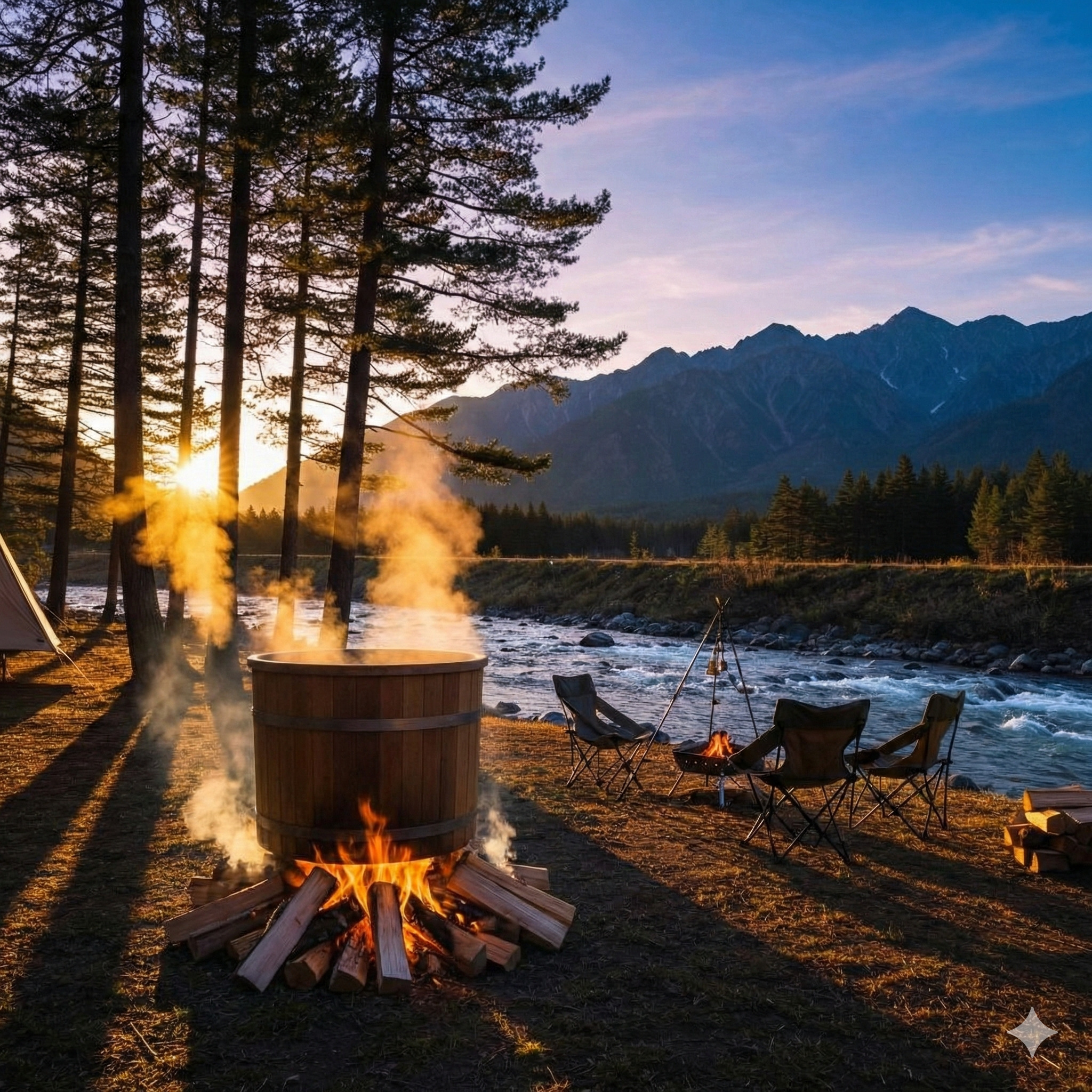 本物の薪で沸かすドラム缶風呂。揺らめく炎と共に、贅沢なアウトドアバスタイムをお楽しみください。